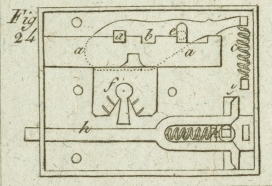 leiten, wenn er vor und ruͤkwaͤrts gleitet, f, ist die Bruͤke und der Waͤchter, g, ein kleiner Zapfen, welcher den unteren Theil der Spiralfeder