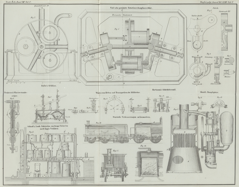 PolytechnischesJournal. HerausgegebenvonDr. Emil Maximilian Dingler. Vierte Reihe. Zweiundzwanzigster Band. Jahrgang 1864. Mit sieben Tafeln Abbildungen. Augsburg.Druck und Verlag der J. G. Cotta'schen Buchhandlung. PolytechnischesJournal. HerausgegebenvonDr. Emil Maximilian Dingler. Hundertzweiundsiebenzigster Band. Jahrgang 1864. Mit sieben Tafeln Abbildungen. Augsburg.Verlag der J. G. Cotta'schen Buchhandlung. Inhalt des hundertzweiundsiebenzigsten Bandes. Erstes Heft. I. Maschine zum Eintheilen von Zollstäben etc. Mit Abbildungen auf Tab. I. 1 II. Die amerikanischen Hinterladungsgewehre des Lindner'schen Systems. 2 III. Maschine zum Durchstoßen Nieten und Schneiden der Bleche, von Cook und Comp., Mechaniker in Glasgow. Mit Abbildungen auf Tab. I. 4 IV. Hydraulischer Durchstoß von J. Tangye in Birmingham. Mit Abbild. auf Tab. I. 6 V. Das Cylindergebläse von Leyser und Stiehler in Wien. 8 VI. Apparat Zum Ueberhitzen des Dampfes, von Th. Baldwin in Bury, Lancashire. Mit Abbildungen auf Tab. 1. 10 VII.Laurent's Apparat für Dampfbäder zu medicinischen Zwecken; Bericht von Jacquelain. Mit Abbildungen auf Tab. I. 11 VIII. Beschreibung eines aus der Eckert'schen Maschinenfabrik hervorgegangenen Mechanismus zur Bewegung der Rührer und der Flügel bei Kühlschiffen; von Dr. Robert Schmidt, Civilingenieur in Berlin. Mit Abbildungen auf Tab. I. 13 IX. Ueber die Getreidemühlen der Londoner Ausstellung vom Jahre 1862. 14 X. Beschreibung eines Backofens für Braunkohlen-Feuerung; von Dr. Rob. Schmidt, Civilingenieur in Berlin. Mit Abbildungen auf Tab. I. 19 XI. Versuche über die Ventilation, welche durch die Zimmerkamme hervorgebracht wird; von A. Morin. 21 XII. Ueber die Verbesserung der Luft durch die Verdampfung des Wassers; von A. Morin. 25 XIII. Ueber eine praktische Vereinfachung bei der Vergleichung galvanischer Ketten nach der Compensationsmethode; von Prof. Dr. A. von Waltenhofen in Innsbruck. Mit einer Abbildung. 27 XIV. Ueber die Construction von Saccharometern nebst dazu gehörenden Procent-Thermometern, mit deren Anwendung man bei jedem Temperaturgrade zwischen dem Frost- und Siedepunkt den Concentrationsgrad einer Zuckerlösung sofort ersehen kann; von Dr. G. Th. Gerlach. Mit einer graphischen Darstellung auf Tab. II. 31 XV. Ueber den Einfluß eines Zusatzes von Wolframmetall zur Geschützbronze, zum Gußeisen und zum Stahl; von Caron, Director des chemischen Laboratoriums des Central-Depots der Artillerie zu Paris. 43 XVI. Fernerer Beitrag zur Kenntniß und Geschichte des Aluminiums; von Carl Karmarsch. 49 XVII. Ueber die Anwendung von Oel beim hydraulischen Cement; von Saint-Cricq Casaux. 57 XVIII. Die Entstehung von Melasse in Folge des Salzgehaltes des in Zuckerfabriken angewandten Wassers; von Dr. C. Stammer. 58 XIX. Die Bleichung und Färbung der französischen Immortellen; von Dr. H. Schwarz. 62 XX. Destillationsproducte der Glanz- oder Pechkohle von Zwickau (Tiefbau) im Königreich Sachsen; von Dr. H. Vohl in Cöln. 68 Miscellen. Die Dampfstrahlpumpe als Wassergewältigungsapparat. 70 Eisen-Schiffbau in Oesterreich. 71 Petroleum als Brennmaterial für die amerikanische Dampf-Marine. 71 Weberschützen aus Aluminiumbronze. 72 Ueber die Krupp'sche Gußstahlfabrik in Essen. 72 Untersuchung von Zündpillen für Zündnadelgewehre; von Dr. Wiederhold. 72 Ueber das Vorkommen von Thallium in Braunstein; von Professor Bischoff in Lausanne. 73 Mißbrauch bei Braunsteinanalysen; von Dr. R. Fresenius. 73 Beleuchtung der Arbeiterwerkstätten. 73 Herschel's Cyanotyp-Verfahren. 74 Ueber den Farbstoff der Brassica purpurea. 74 Das Bouquet der französischen Weine und das käufliche sogenannte Weinaroma. 75 Das Terpenthinöl in technischer Beziehung und dessen Surrogate; von Carl Leber, Apotheker in Griesheim bei Darmstadt. 75 Fabrication von Hornknöpfen. 77 Ueber den Unterschied zwischen Corduan, Saffian und Chagrin, und über deren Anfertigung. 77 Bekanntmachung des königl. württembergischen Medicinalcollegiums über die Schädlichkeit des trichinenhaltigen Schweinefleisches. 78 Experimentaluntersuchungen über die Entwickelung des Getreides; von Isidore Pierre. 79 Interessante Resultate von Boden-Analysen. 80 Mittel gegen die Schaben. 80 Reinigung der Viehwägen auf Eisenbahnen. 80 Zweites Heft. XXI. Die Laubereau-Schwartzkopff'sche Heißluftmaschine; von Conrector G. Delabar. Mit Abbildungen auf Tab. III. 81 XXII. Ueber die Anwendung des destillirten Wassers zum Speisen der Dampfkessel. 109 XXIII. Ueber den Nutzen der Vorwärmer bei Dampfkesselanlagen. 112 XXIV. Eincylindrige Dampfmaschine mit doppelter Expansion; von E. E. Allen in London. Mit Abbildungen auf Tab. III. 116 XXV. Verbesserte Zapfenlager mit selbstthätiger Schmierung, von H. Wren und J. Hopkinson in Manchester. Mit Abbildungen auf Tab. III. 118 XXVI. Maschine zum Reinigen des Lehmes und Pressen von Backsteinen auf trockenem Wege; construirt von W. Heß, Lehrer für praktische Mechanik an der königl. Kreis-Gewerbeschule in Würzburg. Mit Abbildungen auf Tab. III. 119 XXVII. Verbesserungen am Papierzeug-Holländer, von B. Lambert in London. Mit Abbildungen auf Tab. III. 121 XXVIII. Der patentirte F. A. Wenck'sche Trockenapparat mit Dampfheizung für Tabak, Malz etc. Mit Abbildungen auf Tab. III. 122 XXIX. Ueber einige Einwirkungen von Hitze auf Flüssigkeiten; von W. R. Grove. 130 XXX. Gyrotropischer Apparat; von C. A. Grüel, Mechaniker in Berlin. Mit einer Abbildung auf Tab. III. 132 XXXI. Ein sehr rasch arbeitendes negatives Silberbad; von Dr. F. Schnauß. 133 XXXII. Neue photographische Copirmethoden ohne Silbersalze; von Johann Obernetter. 135 XXXIII. Sodafabrication mittelst Oxalsäure; von Prof. Dr. Rudolph Wagner. 139 XXXIV. Vergleichende Zusammenstellung der Fabricationskosten des Glaubersalzes in England und in Frankreich; von Chandelon. 140 XXXV. Ueber die Erkennung und Nachweisung außerordentlich kleiner Quantitäten von Salpetersäure; von Dr. Hermann Sprengel. 142 XXXVI. Ueber Salpetersäure-Bestimm
